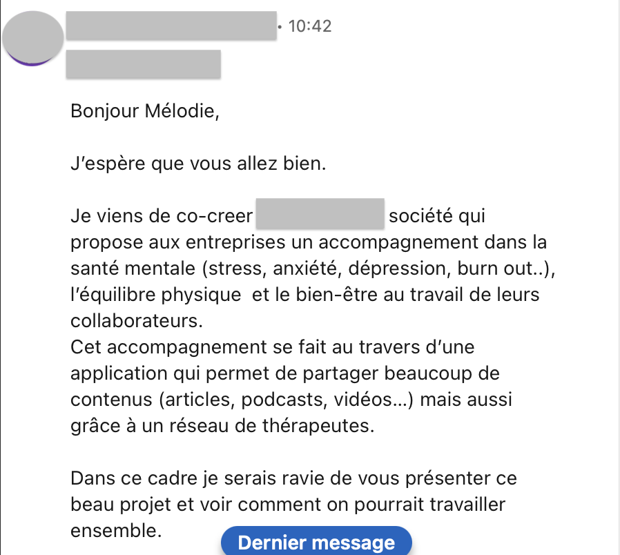 "Avec Mélodie, le concret et l'authenticité vont de pair ! J'ai apprécié son accompagnement qui équilibre l'apport de connaissances et la mise en pratique. Elle a su très vite comprendre le cœur de mon activité et adapté son suivi en fonction. Les modules sont accessibles, on peut y aller à son rythme et découvrir toutes les subtilités pour une démarche de prospection non invasive et éthique ! Envie d'être accompagné.e par une personne impliquée et déterminée pour faire briller votre projet ? N'hésitez pas, Mélodie est la personne qu'il vous faut ! ;)"
