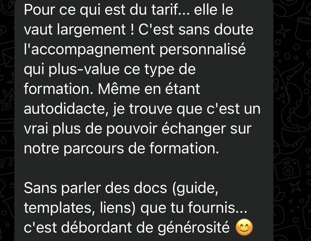 Dans cette formation, tu accéderas à TOUTES les stratégies qui m'ont permis de vivre confortablement de mon activité et d'obtenir tous ces résultats. Tout y est expliqué en toute transparence, avec simplicité et pédagogie. Si j'ai réussi grâce à ces méthodes, tu réussiras aussi car je n'ai rien de plus que toi ! À une seule condition : que tu passes à l'action et que tu mettes réellement en application tout ce que je t'enseigne dans la formation.
